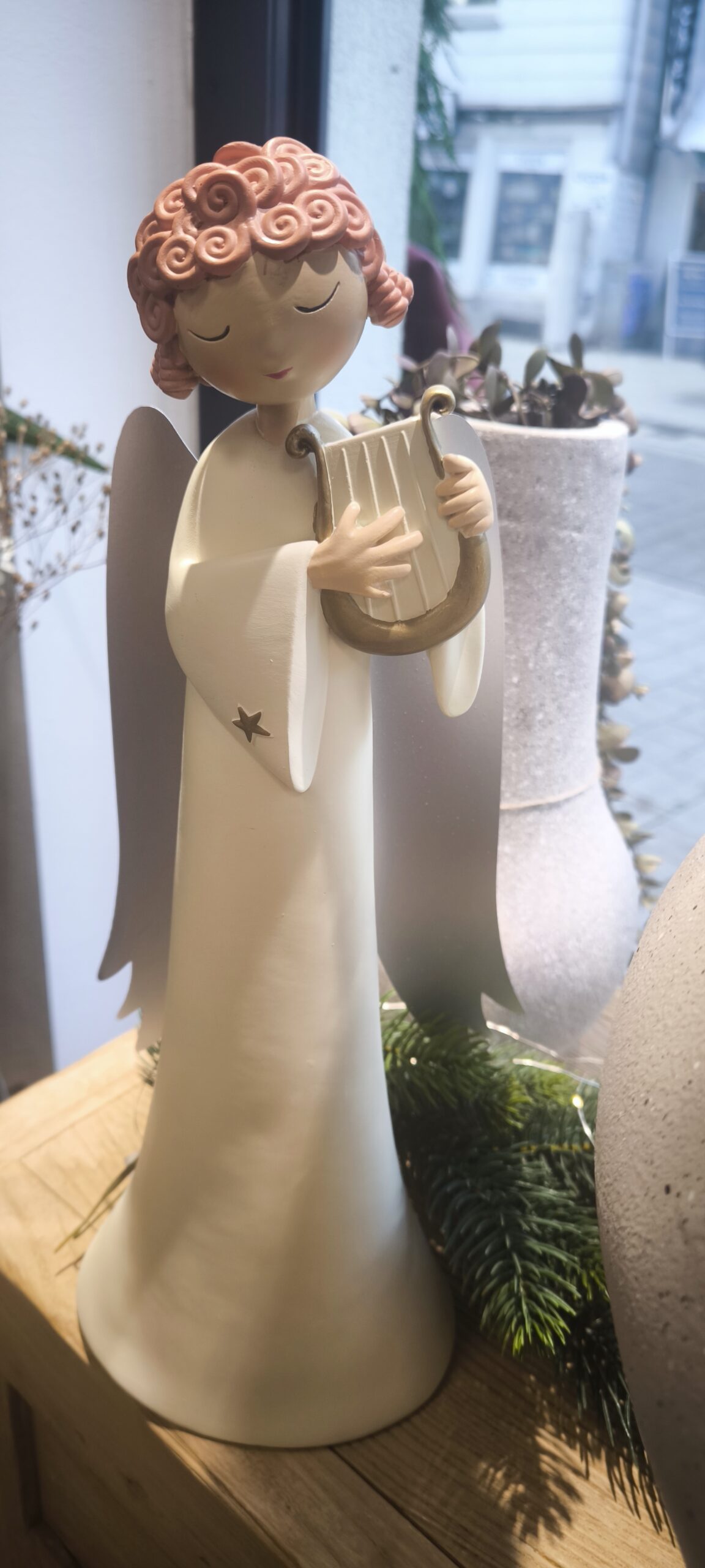 In seinen Hรคnden hรคlt er eine feine Harfe โ€“ ein Symbol fรผr himmlische Musik und festliche Stimmung. Jedes Detail, von den Flรผgeln bis zur Harfe, ist sorgfรคltig gearbeitet und macht jede Figur zu einem einzigartigen Kunstwerk.