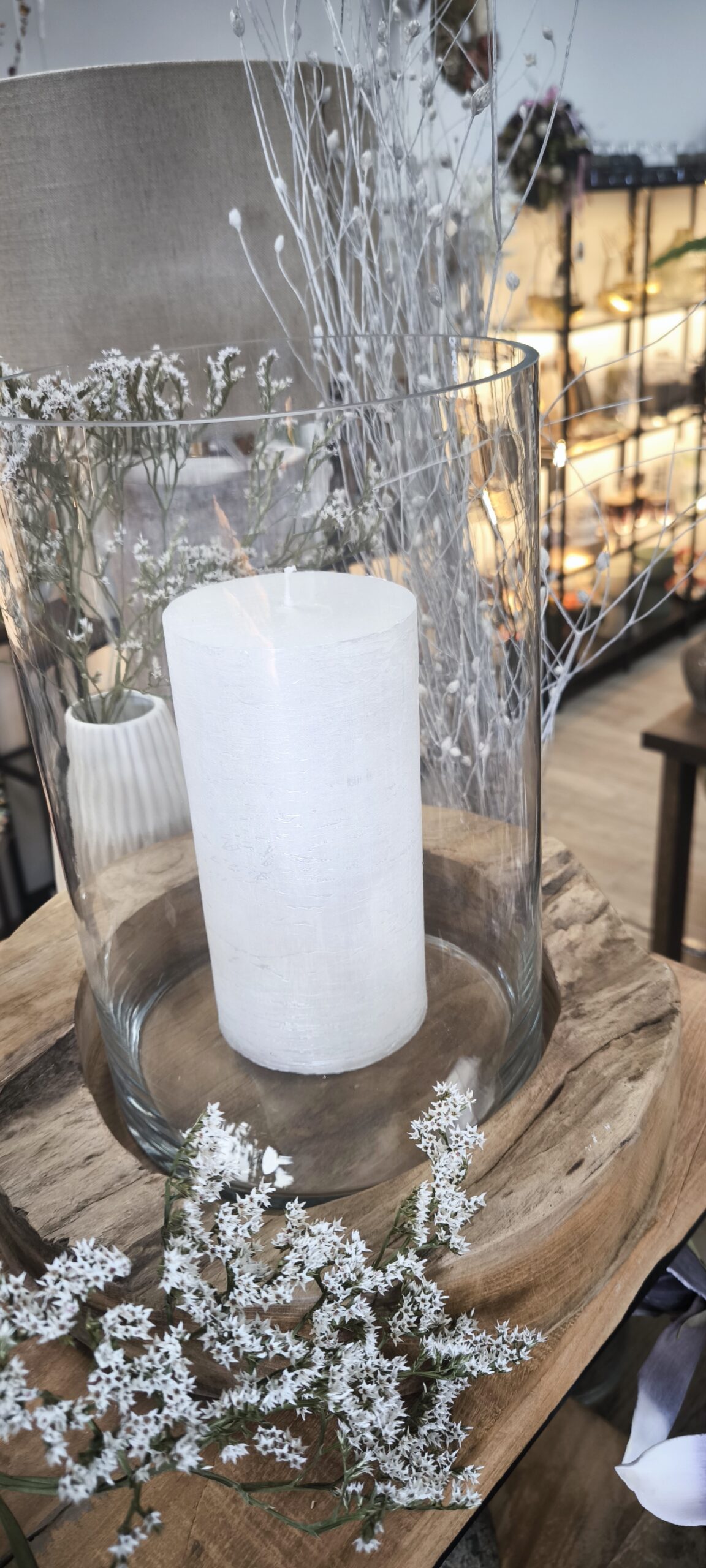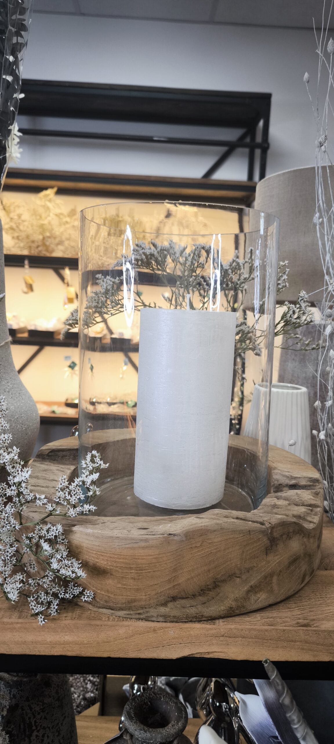 Stilvolle Dekoration bestehend aus einer stabilen Holz-Grundplatte aus Naturholz und einer darauf platzierten Glasvase. Dieses dekorative Set bietet viele Gestaltungsmöglichkeiten – die Glasvase kann befüllt oder außen dekoriert werden, ideal für kreative Arrangements. Perfekt geeignet für größere Räume wie Wohnzimmer, Schlafzimmer oder Küche, aber auch für den geschützten Außenbereich.