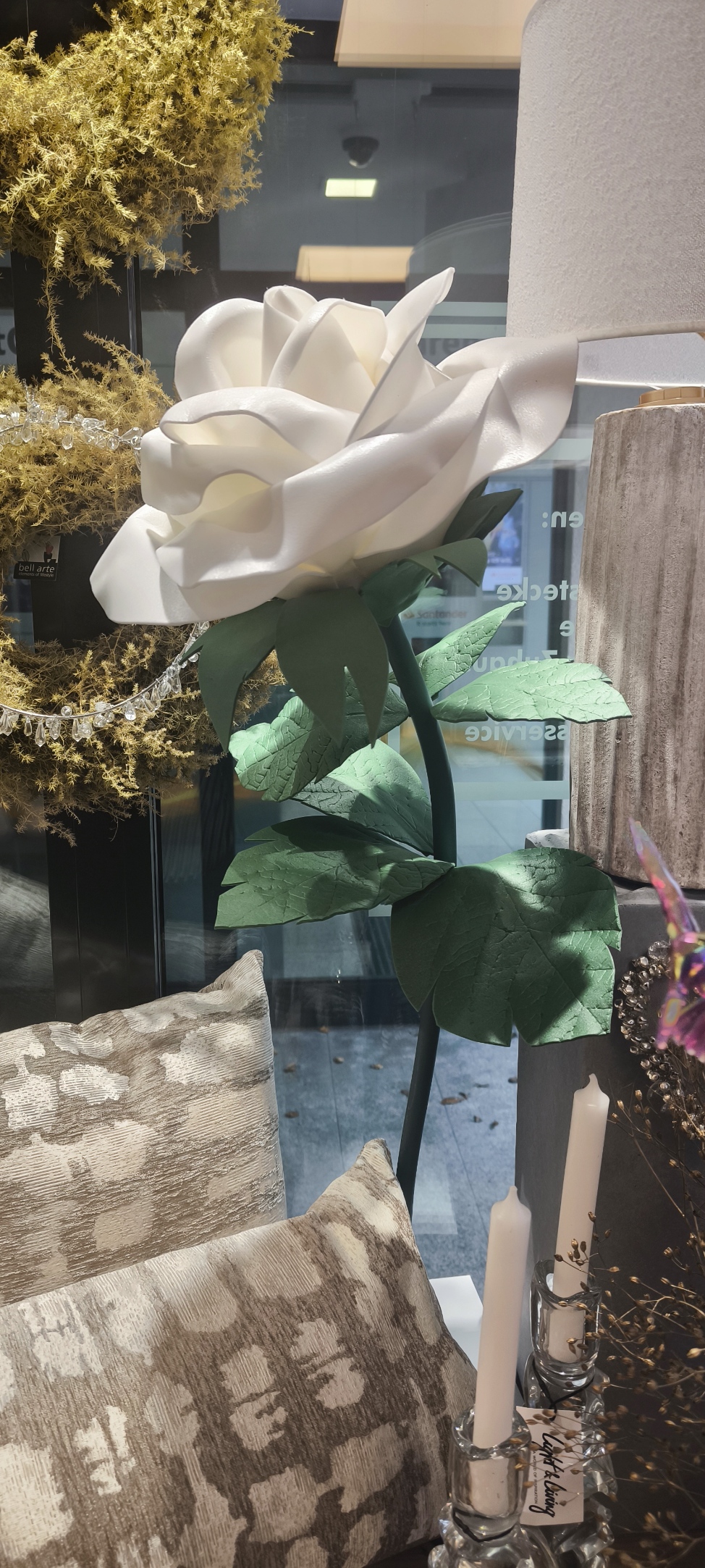 Diese edle, weiße Schaumstoff-Rose wird in liebevoller Handarbeit gefertigt und überzeugt durch ihre hochwertige Verarbeitung und beeindruckende Größe. Mit einem Kopfdurchmesser von ca. 35–40 cm und einer Höhe von 70–80 cm ist sie ideal für elegante Dekorationen bei Hochzeiten, Events, Schaufenstern oder Fotokulissen – ein stilvoller Blickfang mit langlebiger Wirkung.