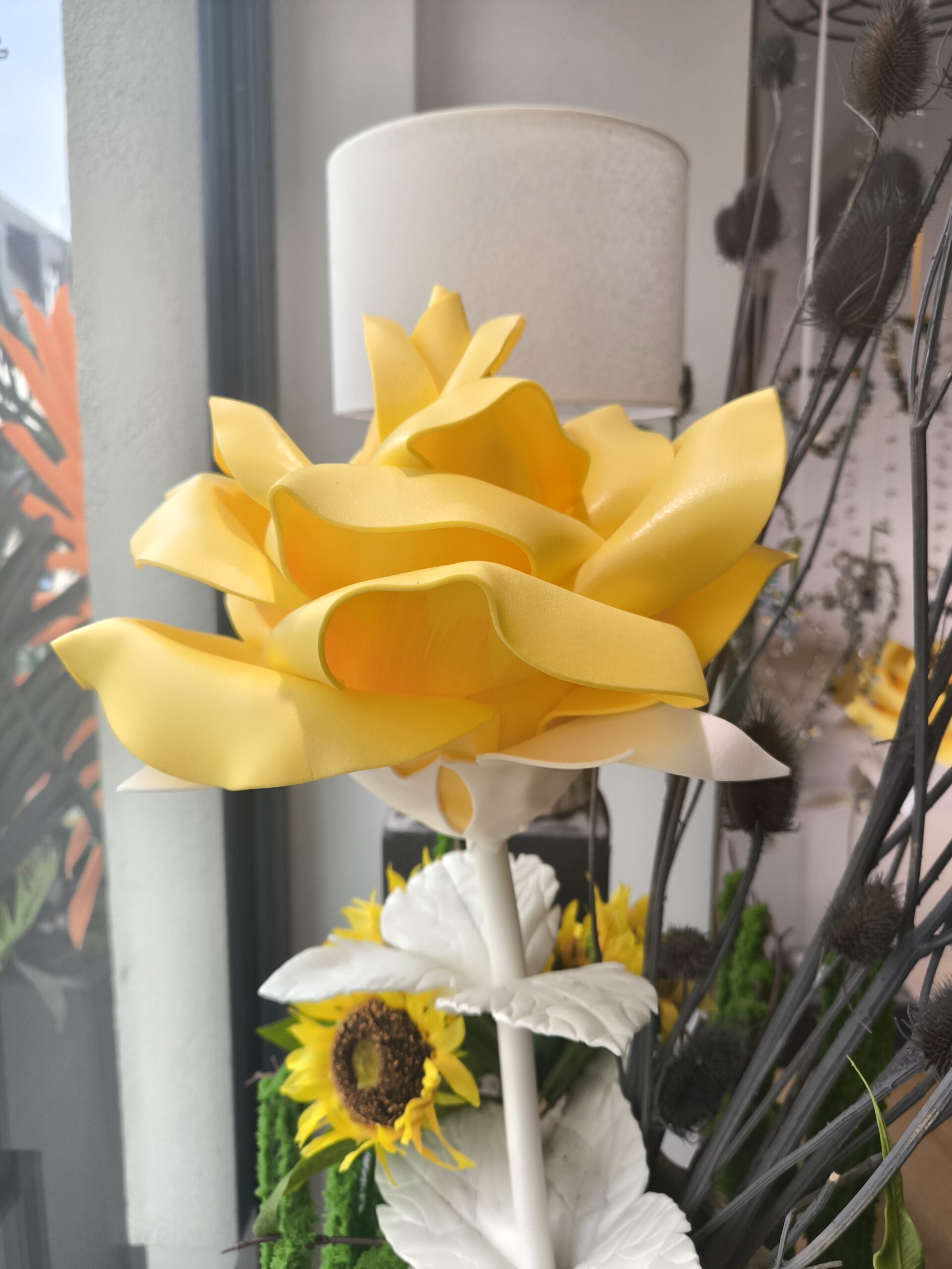 Diese beeindruckende Schaumstoff-Rose wird in liebevoller Handarbeit gefertigt und ist ein echter Blickfang für Events, Schaufenster oder Fotowände. Mit einem Kopfdurchmesser von ca. 35 cm und einer Höhe von 60–70 cm überzeugt sie durch ihre realistische Form und stabile Verarbeitung.