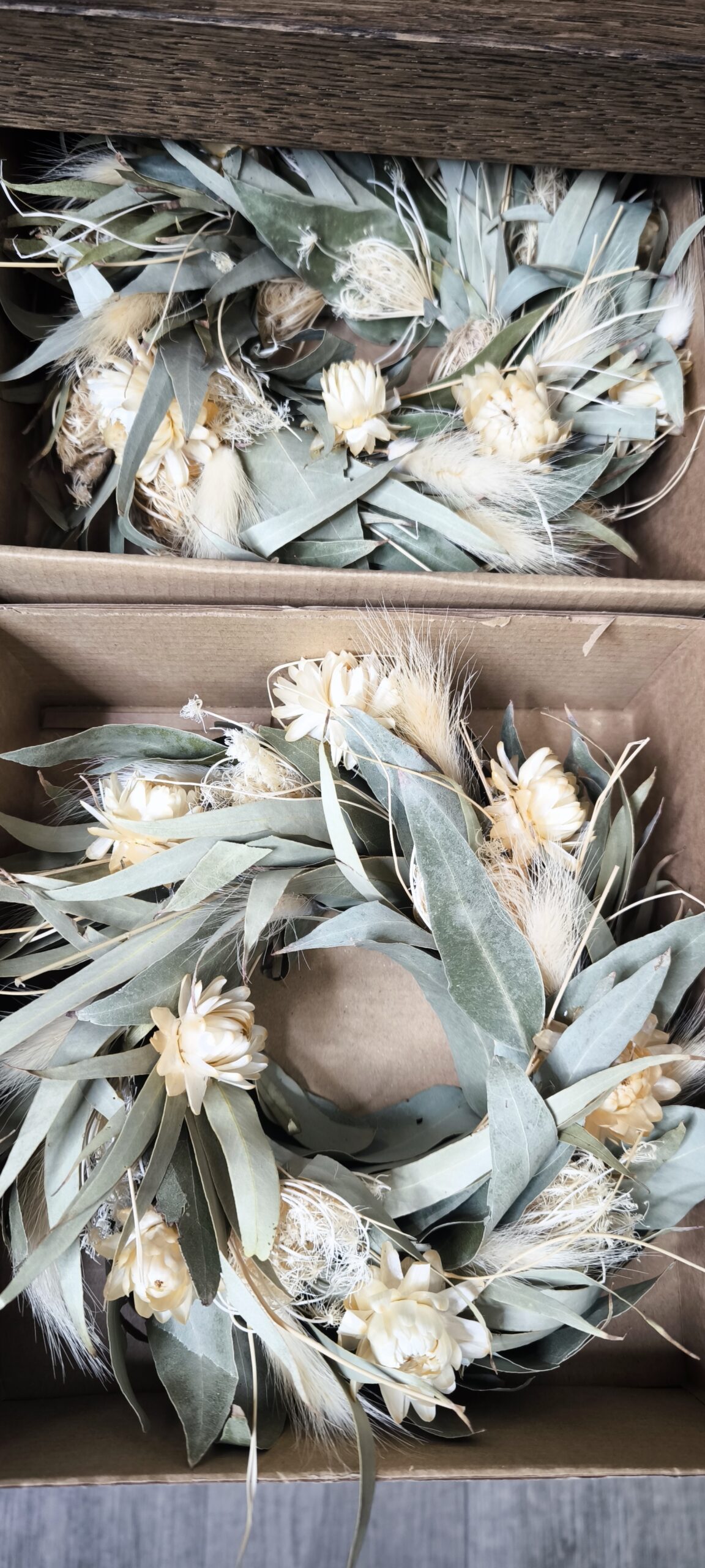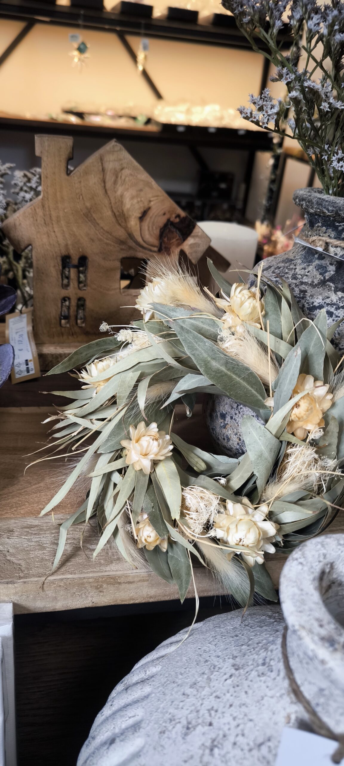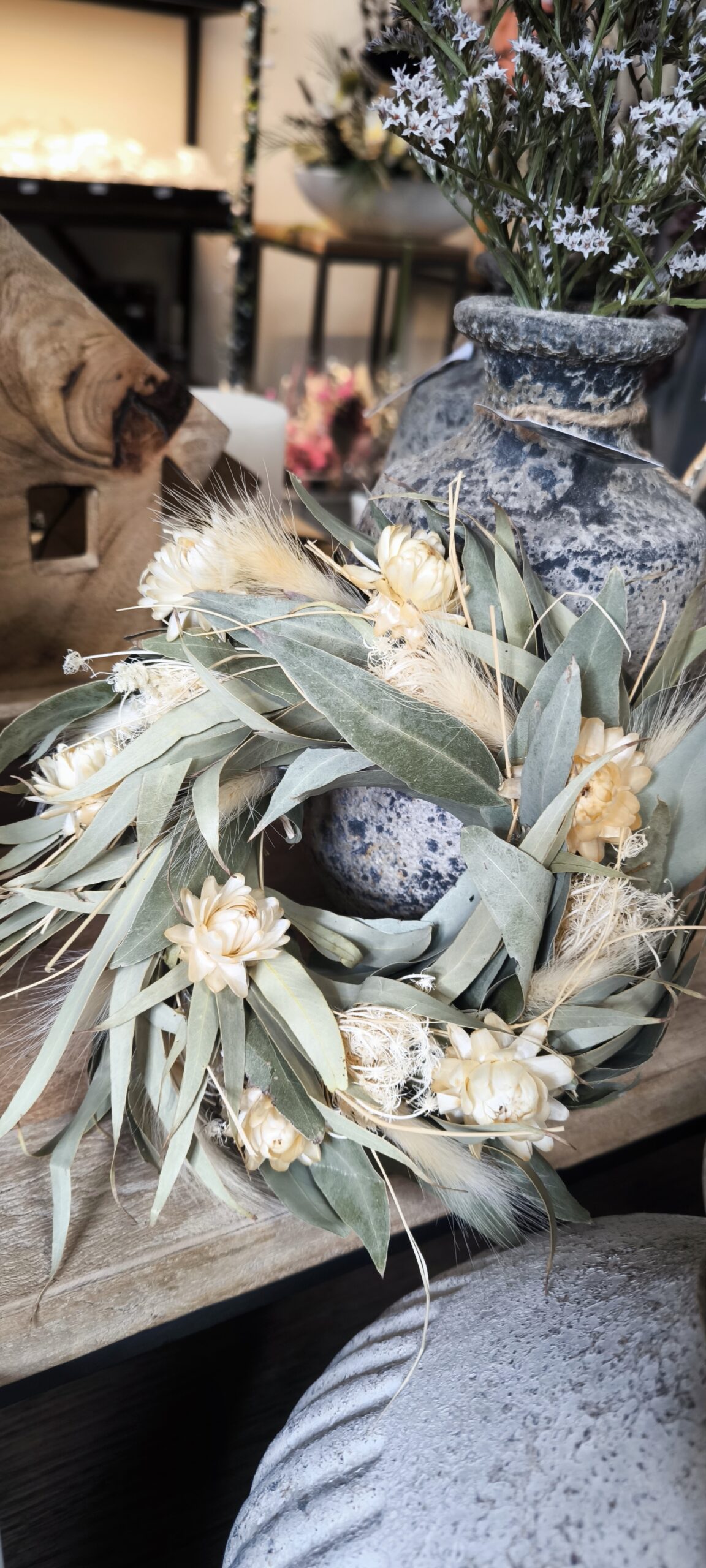 Stilvoller Kranz aus getrocknetem Eukalyptus mit markanter Struktur, ergänzt durch helle, feine Trockenblüten. Der natürliche Look verleiht jedem Raum eine warme und elegante Atmosphäre.