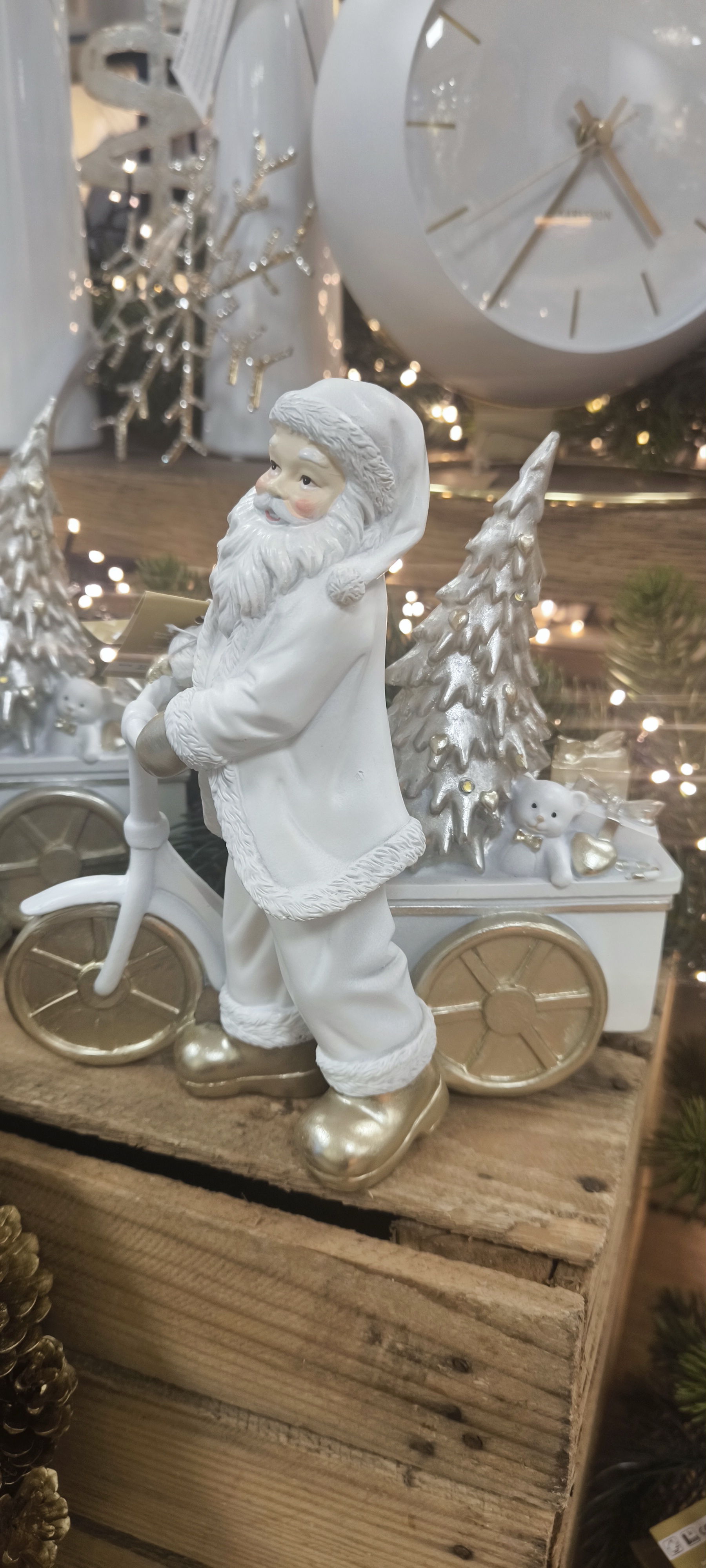 Diese elegante Weihnachtsfigur von TonoSuTono zeigt den Weihnachtsmann, der ein Motorrad mit Anhänger führt – auf der kleinen Ladefläche steht eine leuchtende Tanne mit zarten LED-Lämpchen. Das warme Licht verleiht Ihrer Weihnachtsdekoration eine festliche und gemütliche Atmosphäre.